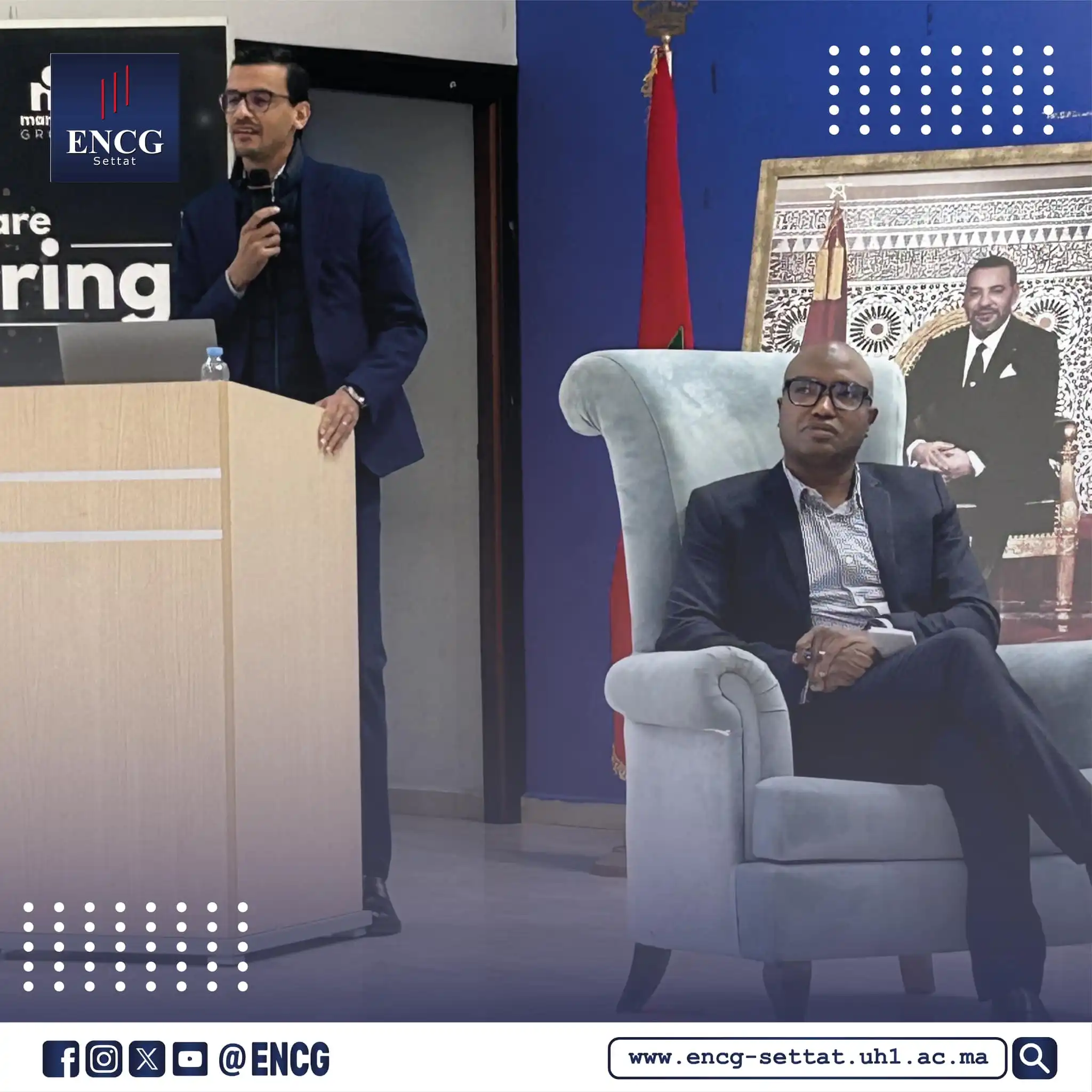 La séance de présentation s’est déroulée en présence de Monsieur le Président de l’#UniversitéHassan1er, de Monsieur le Directeur de l’ENCG Settat, ainsi que des responsables de Marjane Group, notamment :